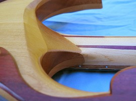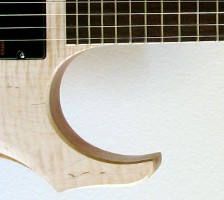 When playing on the highest frets it's really nice to not have a bulky heel in the way. To make playing those frets easy I try to make heels as minimal as I can. On the standard model, however, I leave the heel there, simply because it's easier to manufacture that way and it keeps cost down a little (you can of course add it when ordering). Plus, I feel it doesn't adversely affect virtually all playing scenarios, because since it has a 26-fret neck, the heel still ends really high up the neck, as much as a well-sculpted 24-fret guitar. It doesn't look quite as nice, but you can still reach all the frets very easily.