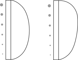 So, what to do? The best solution for these problems is to have a flat fretboard with no hump to get in the way, which means that whether you're playing an open note, a fretted note, or a heavily bent note, the sustain characterestics are all the same, which is to say not encumbered. If you want the comforts of curvature though, you could make the strings not tapered (so every one runs down the length of the cylinder) but that wouldn't be ergonomic, so instead you make the fingerboard into a section of a cone rather than a cylinder. You can see that the strings want to make a cone if you think about how the strings would taper to a point beyond the nut and spread infinitely beyond the bridge if you extended them out. Conical section fretboards can be done correctly, but rarely are, usually because the chosen cone shape has circular cross sections that change in radii too quickly (picture 5) when they should change more slowly (picture 6). People choose cones like picture 5 because it means that lower frets will be tightly curved, making it easier to fret chords, and it will be easier for fast playing and string bends on higher, flatter frets. That statement may be true, but if it's overdone it will still end up with problems.