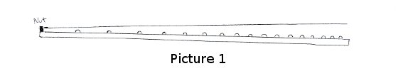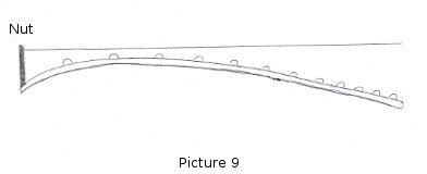 Here is the concept for what is ideal. Let's pretend we're looking at a fretboard from the side (from the side that has the side-dot markers). If you look at one string and the frets underneath it (picture 1), obviously the string goes in a straight line, but the spots on the frets directly underneath it also go in a straight line (Many argue for or against neck relief, which is a slight front-bow in the neck and hence the fret line, but we will ignore that for now in this section). Moving from lower frets to higher ones, there is a steadily increasing amount of distance between the fret and string (string action).