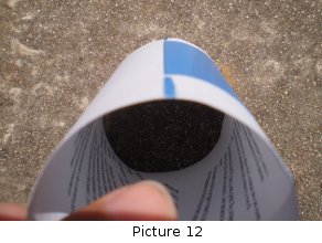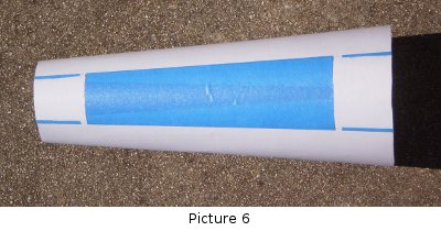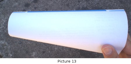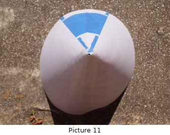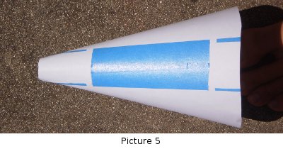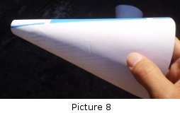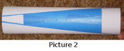 Pictures 7 and 8 show different views of the rapidly changing radii cone from picture 5. The edges of the blue tape (the fretboard) don't go straight down the cone in this case; rather, they move across it kind of like in picture 3. The difference here is the resulting path the frets take under the string curve in a different manner (picture 9), but that's still bad.