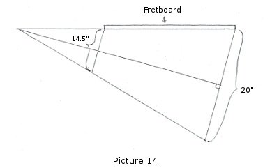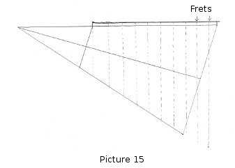 That's the main deal with my fretboards, but here are some other interesting things to note. Using Orb Weaver as an example, I list the fretboard radii as approximately 14.5" at the zero-fret and 20" at the 24th, but that is a tad misleading. I used the term radii because in a sense that is true; those are the radii extending from the cone's long axis to the cone surface/fretboard at those frets (picture 14). It is misleading because the frets aren't in the same plane as the radial cross-sections. Picture 15 shows how if you sort of extend the frets so they wrap all the way around the cone (dotted lines), they originate at one spot along the length of the cone and end up being further down the cone when it wraps around. This means that the frets end up being more elliptical in nature rather than being a section of a circle. It also means that the frets are a little flatter than you would think (e.g. the 24th fret is in the area of the cone that has a 20" radius, but the fret itself is a little flatter than it would be if it were a section of that 20" circle).